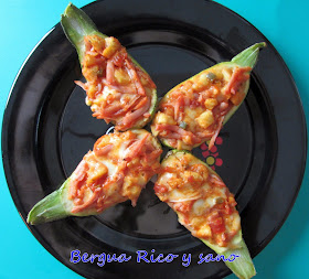 6. Con una cuchara vamos rellenando los calabacines generosamente y les damos otros 5-10 minutos a 200º. El objetivo es que el queso quede fundido y el calabacín acabe de cocinarse. ¡Y a disfrutar mintras están calientes!